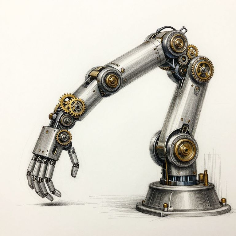 Turn drawing depicting a mechanical hand sketch evolving into a fully functional robotic arm, rendered in steampunk style with gears and cogs, emphasizing the intersection of art, technology, and engineering in a futuristic setting.