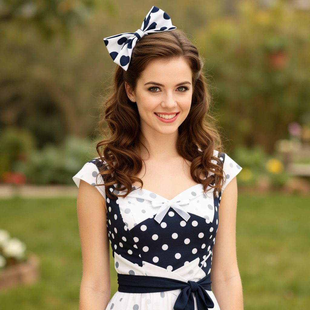 A cheerful young woman smiles warmly in a vintage-inspired polka dot dress complemented by a charming hair bow. Set against a picturesque garden backdrop, her playful yet elegant style evokes a nostalgic vibe reminiscent of classic Americana.