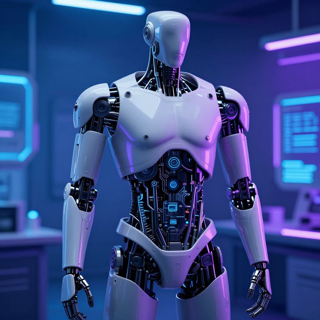 Undress AI men concept featuring android figures standing in a minimalist, futuristic bedroom, their clothing seamlessly retracting to display hybrid human-artificial musculature and embedded LED lights, surrounded by holographic data interfaces and soft ambient lighting.