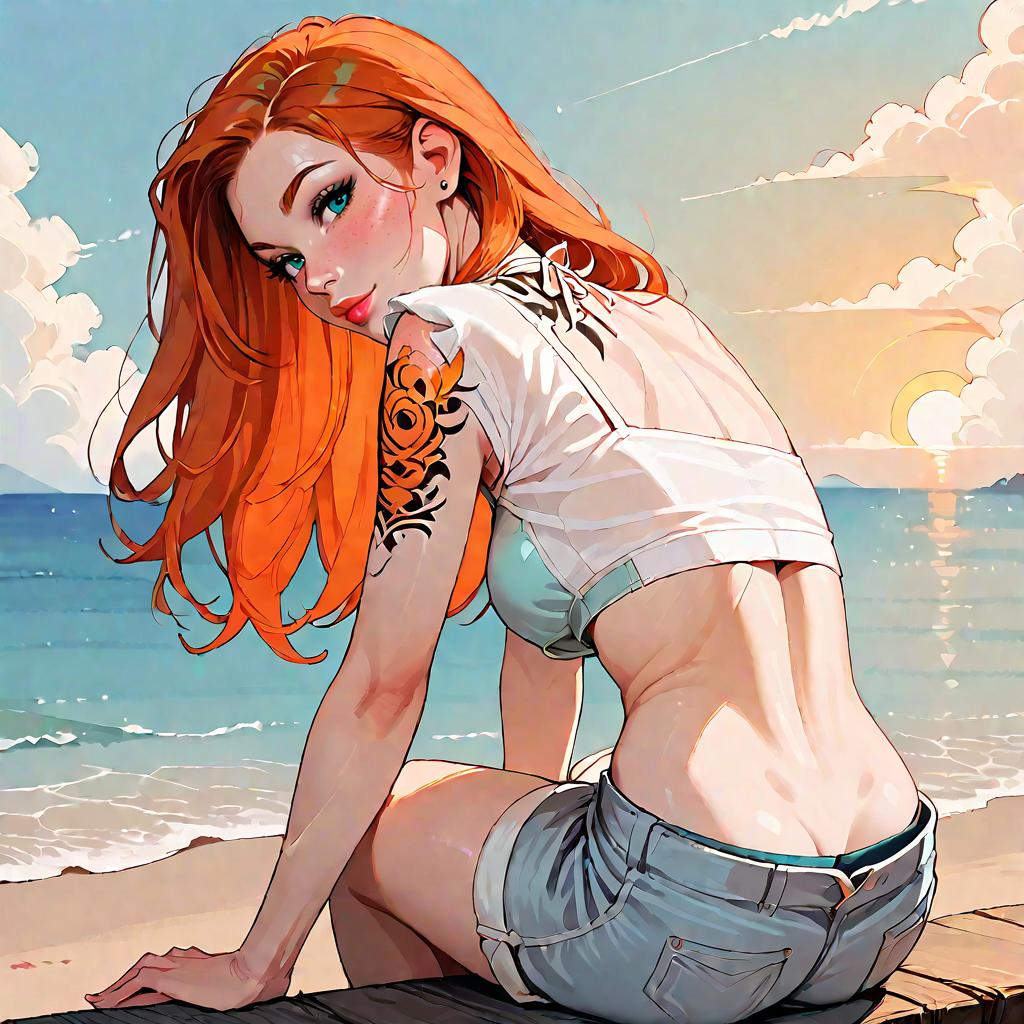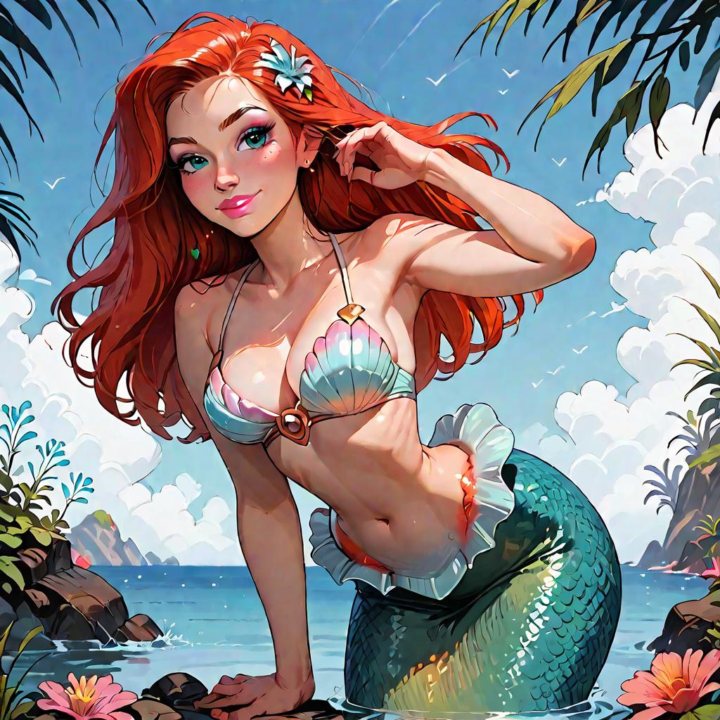 Score_9, score_8_up, score_7_up, score_6_up, ArielWaifu swimming on the sea next to a big rock, leaning forward, cute pose, medium breasts, narrow waist, wide hips, thick thighs, smile, blue eyes, shell bikini, red long hair, disney style, looking at viewer, cute, detailed landscape, cowboy shot, cartoon, 4k, masterpiece, mermaid, mermaid tail, monster girl
