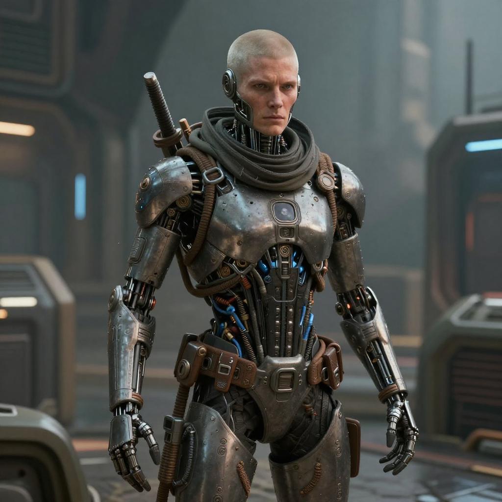 Realistic photo.Detailed ultra-realistic photography, front medium shot of a cyborg scavenger, in a sci-fi cyberpunk environment. Styled with influences from Dune, Waterworld. The character is a cyborg survivor, with intricate detailing and an intense appearance. Inspired by Norman Rockwell, presented with ArtStation cinematic quality, rendered with VRay, and styled with the epic tones of Lord of the Rings. realistic photo