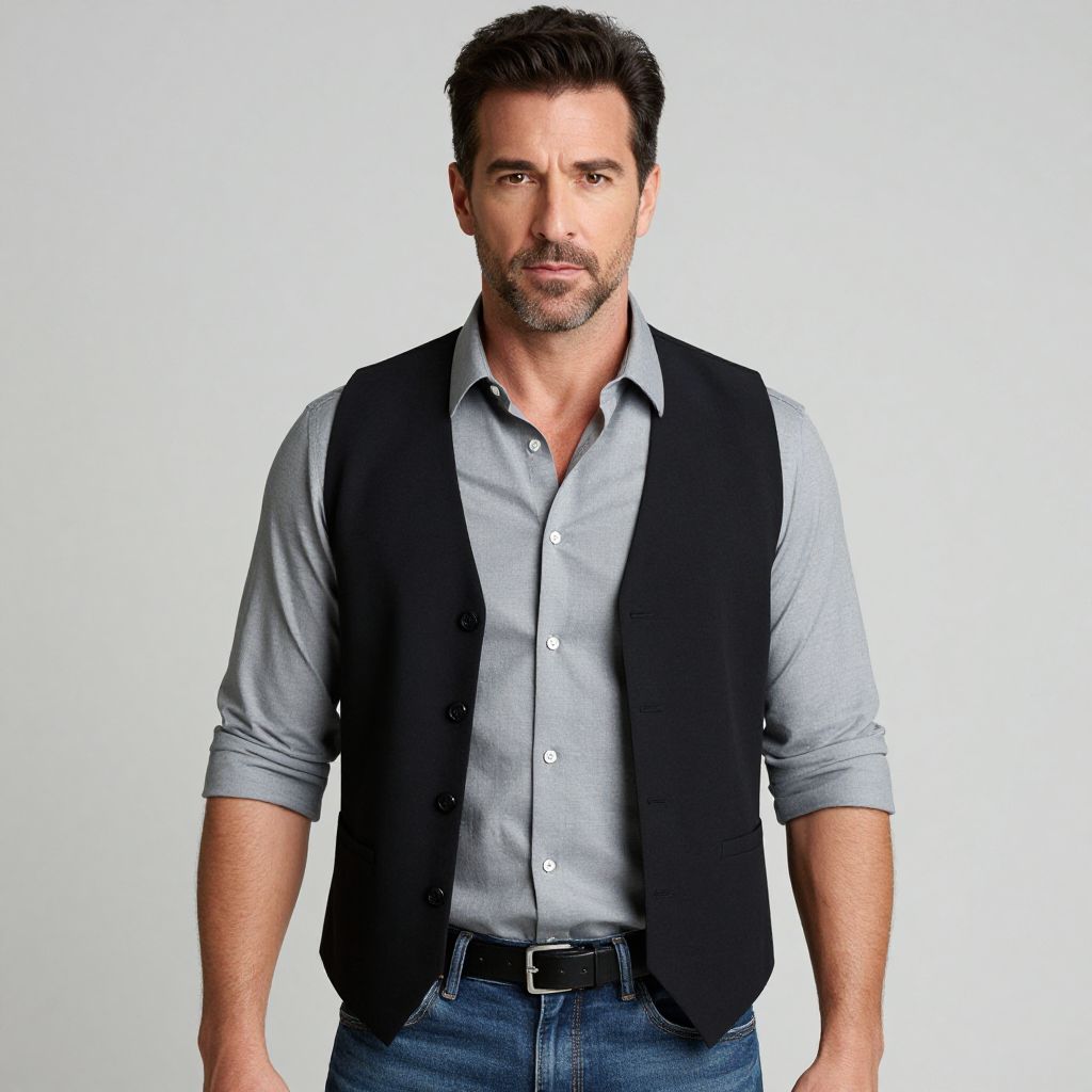 Photograph of a handsome, middle-aged white man with short, dark brown hair and a neatly trimmed beard. He has a strong jawline and piercing blue eyes. He is wearing a light gray, button-up shirt with sleeves rolled up to his elbows, and a black, sleeveless vest over it. His blue jeans are secured with a black belt. The background is a plain, bright white, making him the focal point. His expression is confident and slightly serious, with his hands resting by his sides. The lighting is even, highlighting his facial features and attire.