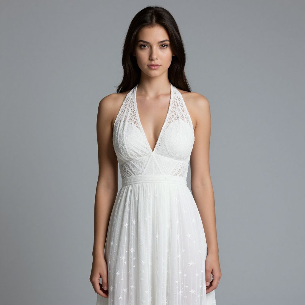 Photograph of a young woman with long, dark brown hair standing against a plain gray background. She's wearing a white, sleeveless, halter-neck dress with a deep V-neck and intricate lace detailing on the bodice. The skirt is adorned with small, star-shaped patterns and a subtle, pleated texture. She has a fair skin tone and a confident, neutral expression on her face.
