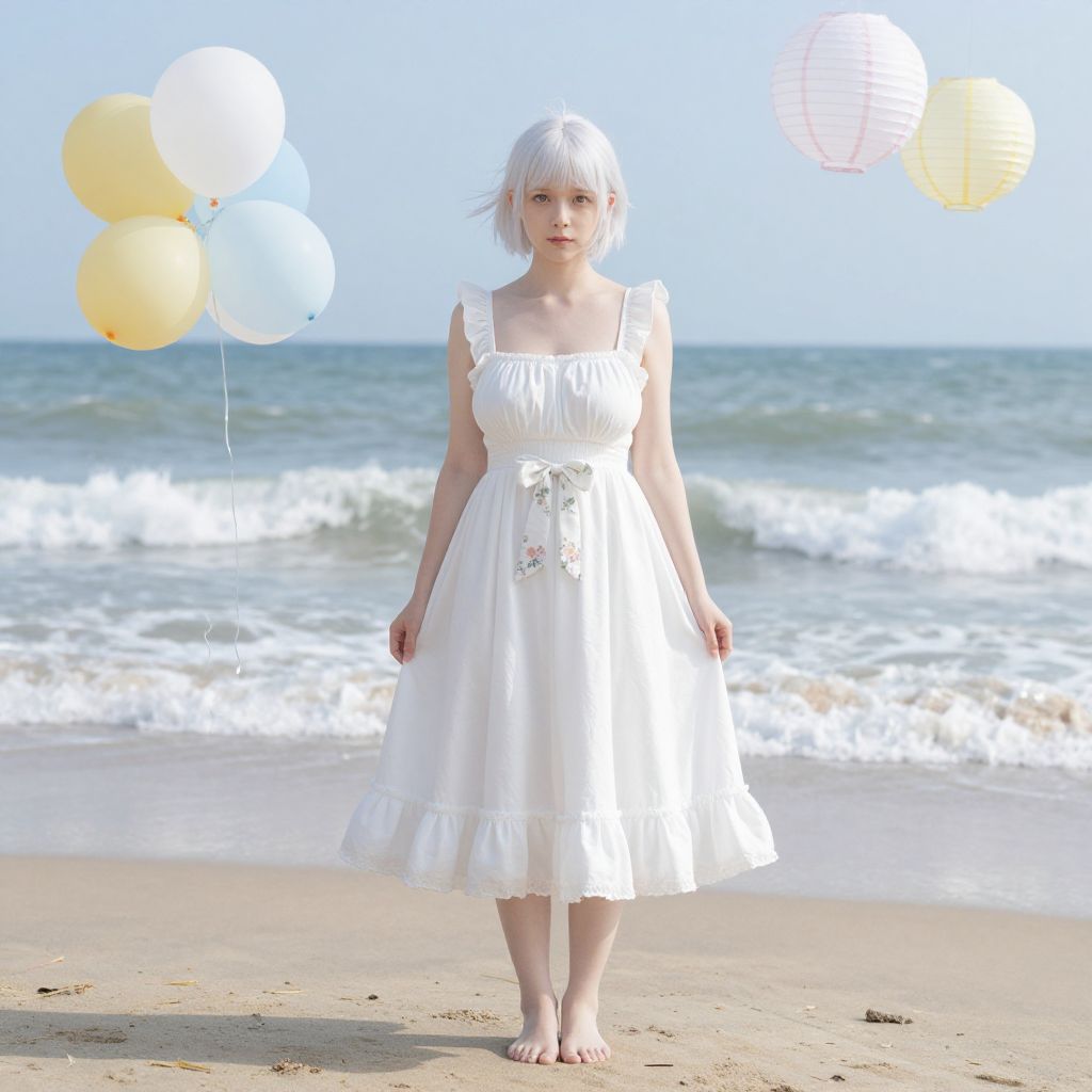 A serene woman with pale skin and soft gray eyes dressed in a pure white midi dress that serves as a whimsical costume for a seaside festival, standing barefoot on a sunny beach with waves gently crashing, the dress slightly ruffled at the hem and tied with a floral bow, surrounded by colorful balloons and paper lanterns.. The woman has big tits and cute face