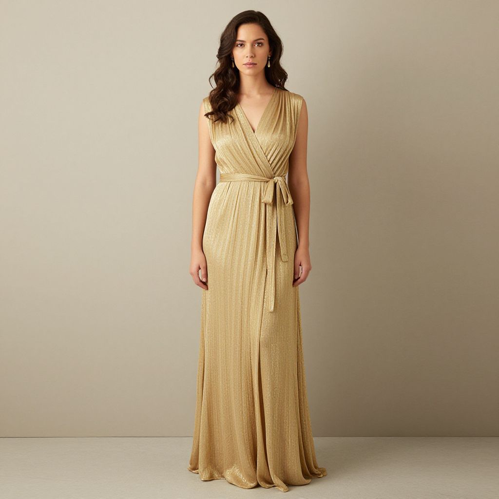 Photograph of a woman with long, wavy dark brown hair standing against a plain, light gray background. She is wearing a floor-length, gold, pleated, sleeveless gown with a deep V-neckline and a tied waist. The gown has a subtle shimmer and a flowing, elegant texture. She stands with a neutral expression, arms relaxed by her sides. The lighting is soft, highlighting the gold color and the fabric's texture. The overall style is elegant and formal, suitable for a formal event or evening occasion.