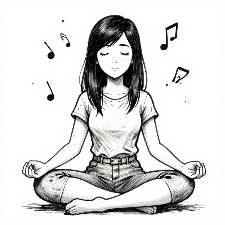 Black and white digital drawing of an Asian woman with straight, shoulder-length black hair, sitting cross-legged in a meditation pose. She wears a plain t-shirt and knee-length shorts, with eyes closed and a serene expression. Musical notes surround her head, indicating she is listening to music. The background is entirely white, making the subject and musical notes stand out. The style is reminiscent of manga or comic art, with clean lines and minimal shading. The woman's hands rest on her knees, palms facing upward.