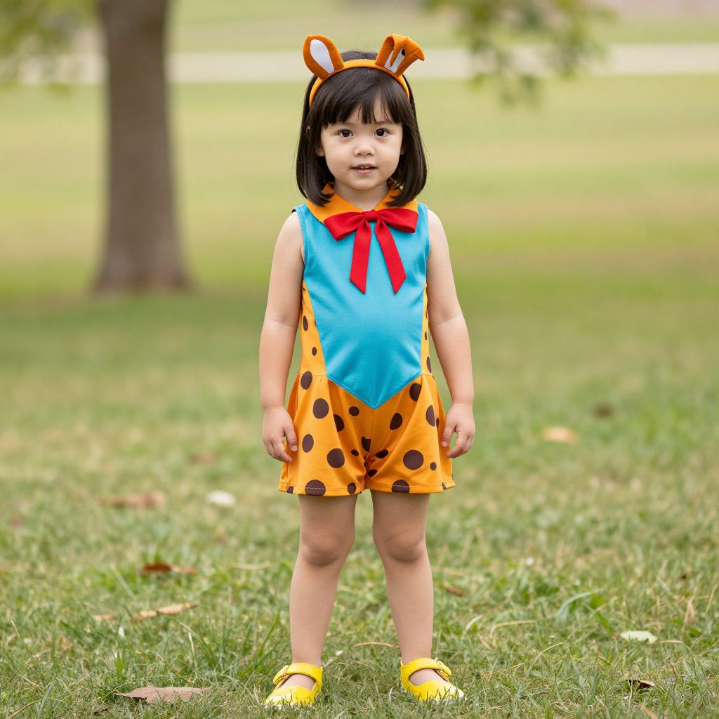 Photograph of an Asian toddler in a Winnie the Pooh costume with blue top, orange polka-dot shorts, red bow, bunny ears,