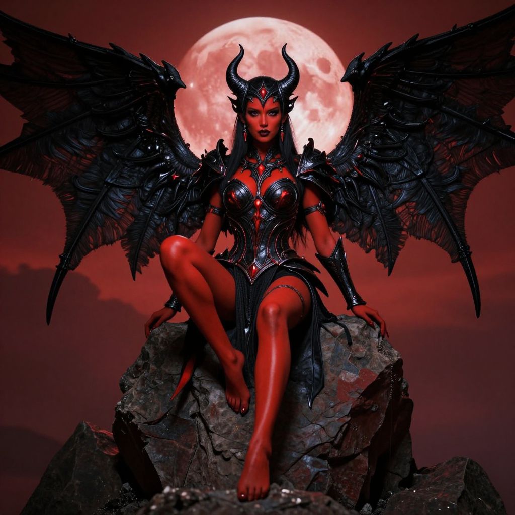 Digital art depicting a red-skinned, demonic woman with black, feathered wings and prominent horns, seated on a rocky outcrop. She wears a black, armored dress with intricate patterns and a matching headpiece. Her breasts are accentuated by the armor, and she has a confident, alluring expression. Her long, dark hair flows down her back. The background features a large, glowing red moon against a dark, cloud-filled sky. The overall color palette is dominated by reds and blacks, creating a dramatic, otherworldly atmosphere. The textures of the wings, armor, and rocky surface are highly detailed.