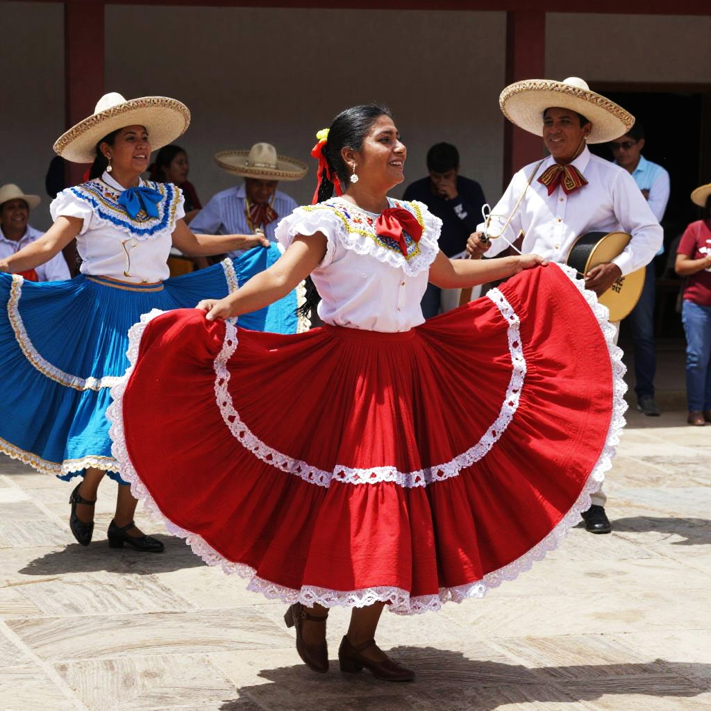 Bolivian folklore traditional dance performance, women with polleras and men with wide-brimmed hats, vivid movement and swirling skirts, lively music ambiance, detailed traditional attire, festive outdoor setting