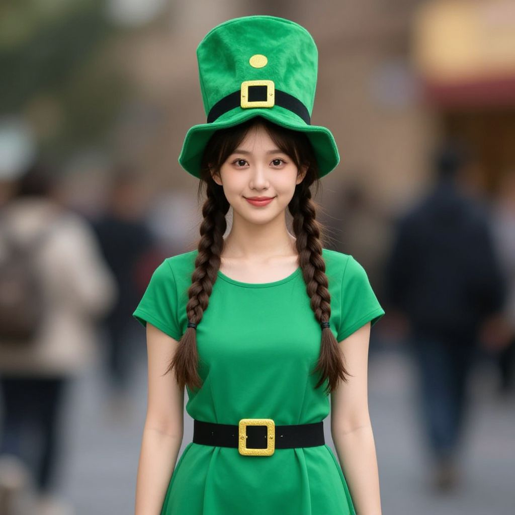 Leprechaun costume girl, 1girl, solo, hat, belt, green headwear, dress, blurry background, green dress, twin braids, braid, looking at viewer, blurry, smile, upper body, short sleeves