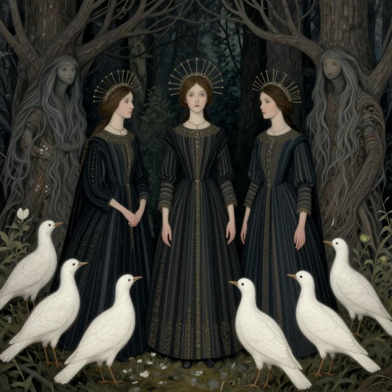 The image depicts a scene inspired by Tove Jansson's style, featuring three female figures dressed in intricate, dark, striped dresses adorned with gold accents, standing in a forested area. Each figure is crowned with a delicate, circular tiara, and they are surrounded by a variety of mystical creatures, including birds and tree-like entities with long, flowing hair. The birds, with their white plumage, are positioned in the foreground, while the tree-like figures, with their dark, twisted branches, frame the scene. The overall composition is balanced, with the figures and creatures arranged symmetrically, creating a sense of harmony and mystery. The dark, muted color palette, combined with the detailed textures of the clothing and the forest, evokes a sense of ancient, otherworldly lore.