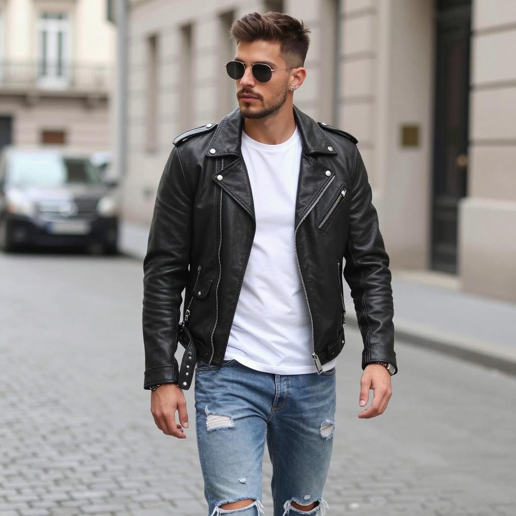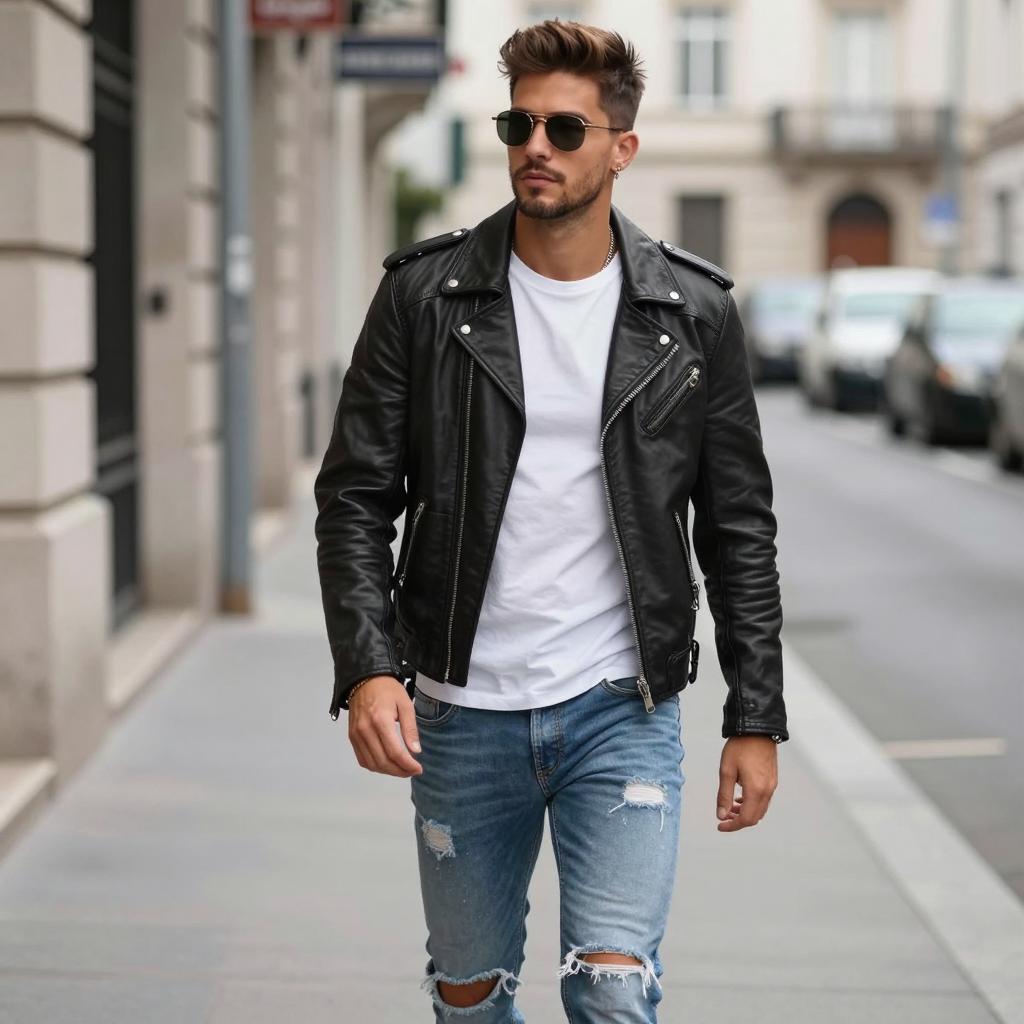 A stylish young man confidently walks down an urban street, showcasing a modern and trendy outfit. He wears a leather jacket layered over a casual white t-shirt, complemented by distressed jeans and accessories, embodying contemporary fashion.