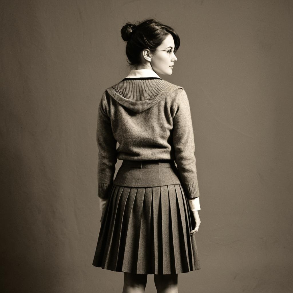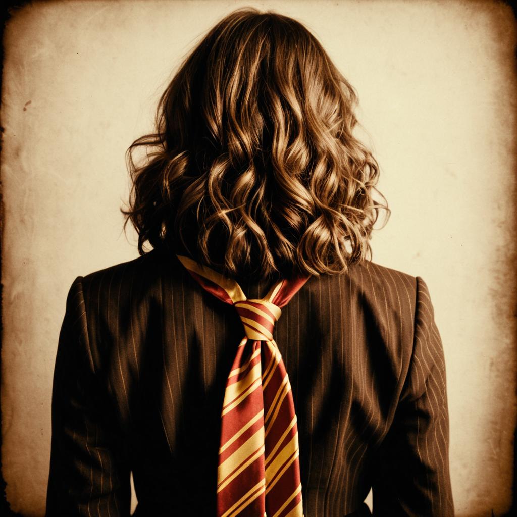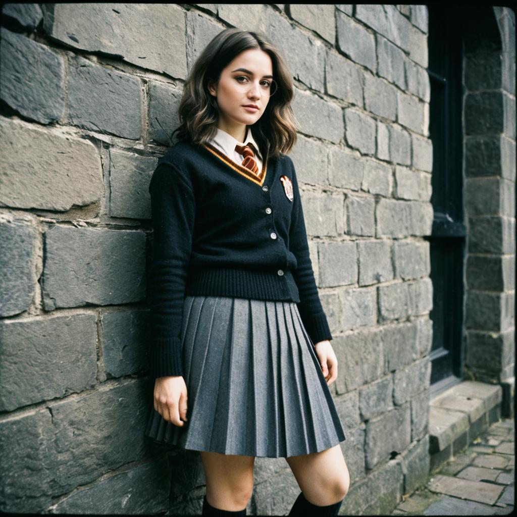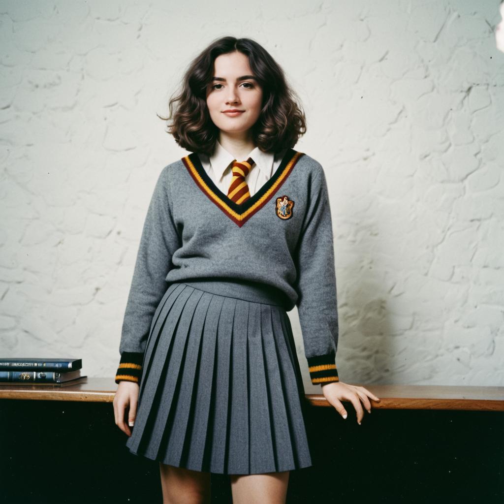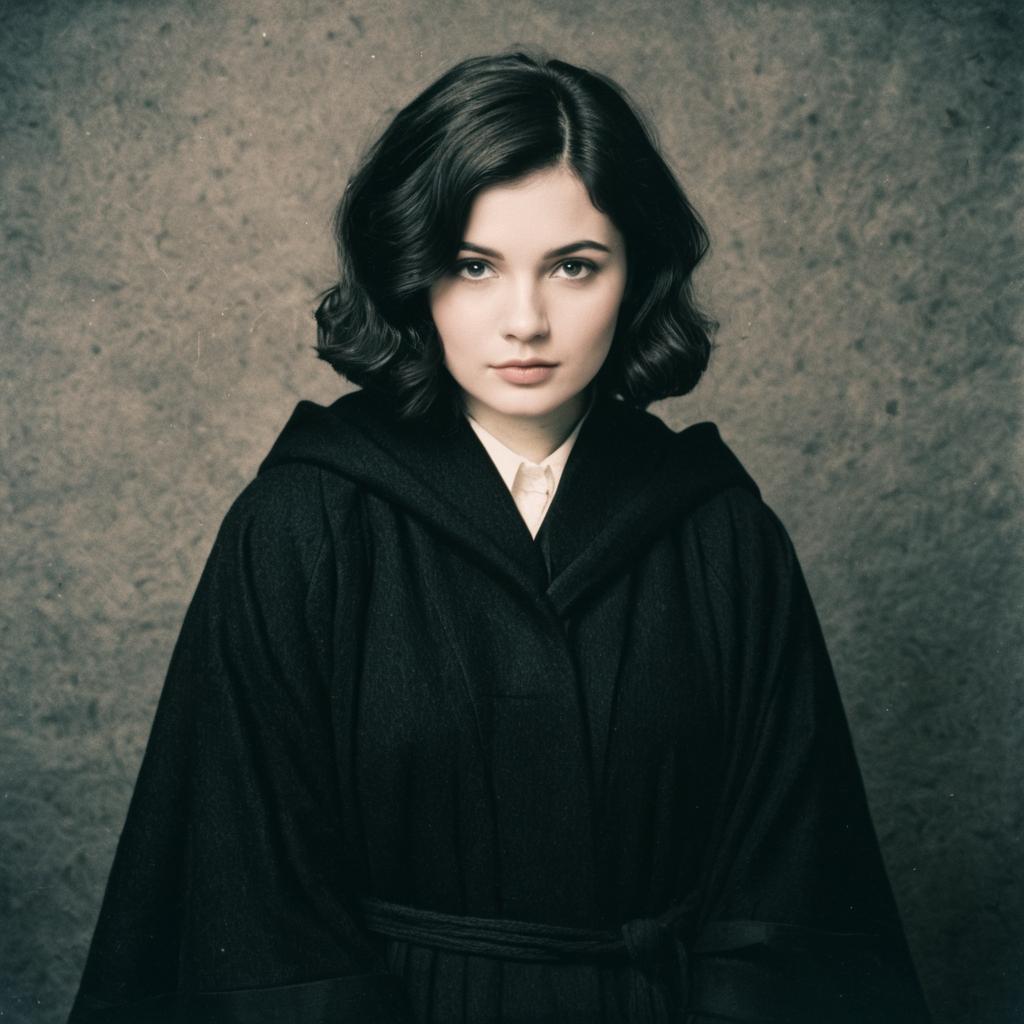 Portrait of a young woman with short wavy dark hair, wearing a black wool robe with a hood and a tie belt, resembling a Harry Potter-style outfit. The image has a vintage analog film look with muted colors and a textured neutral background.