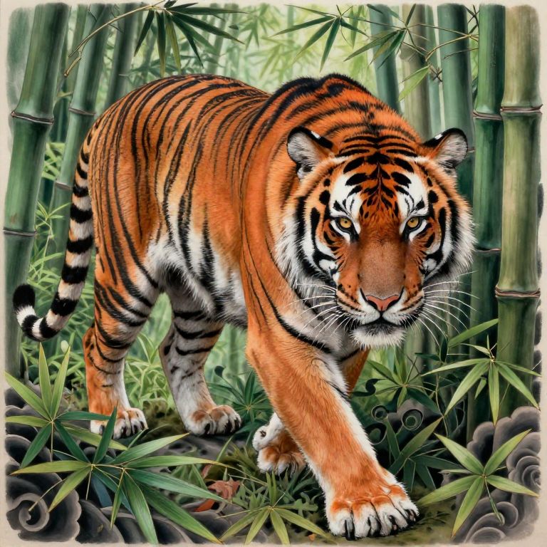 Digital illustration of a powerful, orange-and-black striped tiger walking through lush bamboo forest, with intense gaze and detailed fur texture.