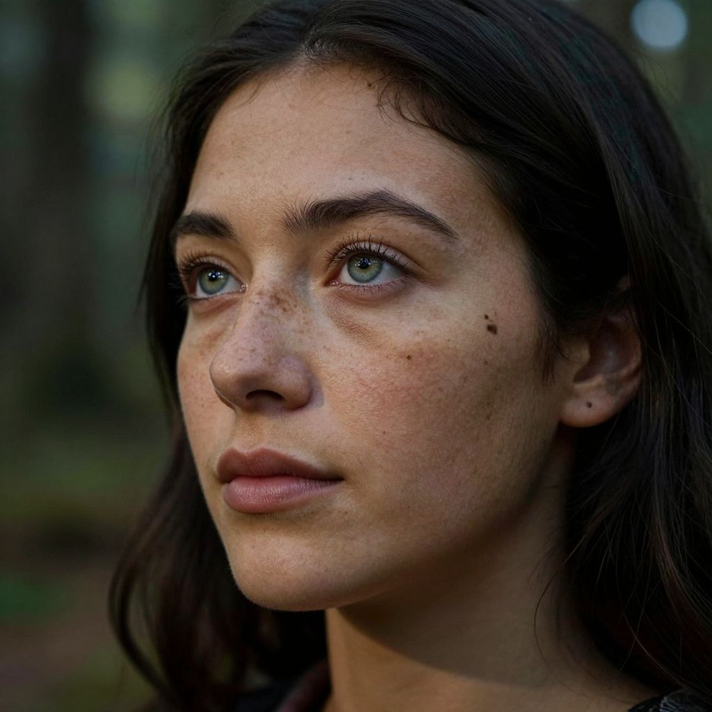 Photograph of a young woman with fair skin, blue-green eyes, and dark brown, wavy hair. She has light freckles across her nose and cheeks, and a small beauty mark under her right eye. Her lips are slightly parted, and she gazes thoughtfully to the left. The background is blurred, featuring dark green hues suggesting a forest setting. She wears a neutral expression, and the lighting highlights the texture of her skin and the natural shine of her eyes. The image has a realistic, detailed style with a focus on natural beauty and subtle emotions.