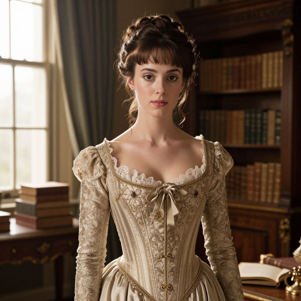 A stunning Victorian lady with porcelain skin, sharp cheekbones, and deep brown eyes, wearing a luxurious corset adorned with intricate lace detailing, standing in a grand 19th-century study filled with antique books and ornate wooden furniture, soft golden hour light filtering through tall windows, elegant period atmosphere with subtle dust motes in the air