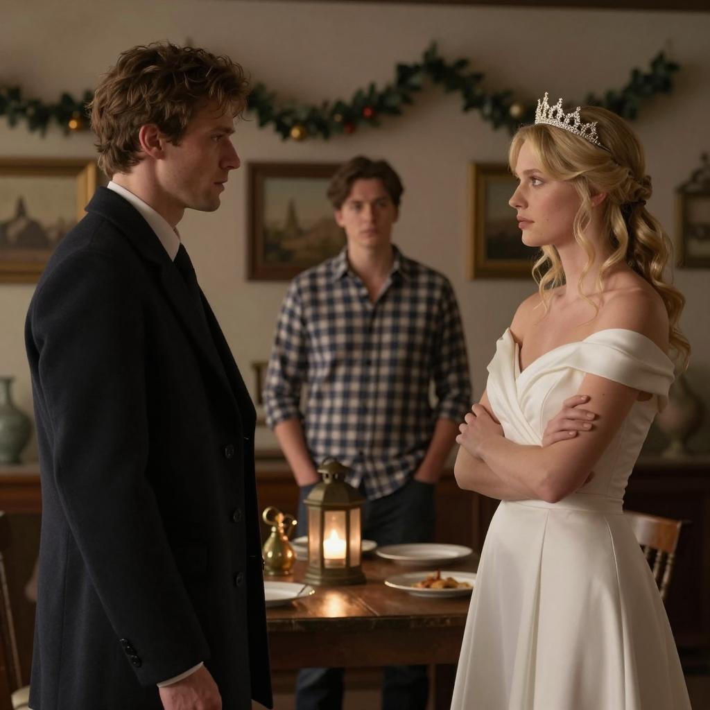 Movie still of five people in a richly decorated room. Center: young man with blond hair, white shirt, brown suspenders, standing, looking surprised. Right: red-haired woman in white dress, back to camera, looking at young man. Left: man in black suit, gesturing with right hand. Background: dark wood paneling, ornate frames, wall sconces. Right background: woman in black dress with floral pattern, standing. Man in gray suit, white shirt, standing on right, looking at young man. Intense expressions.