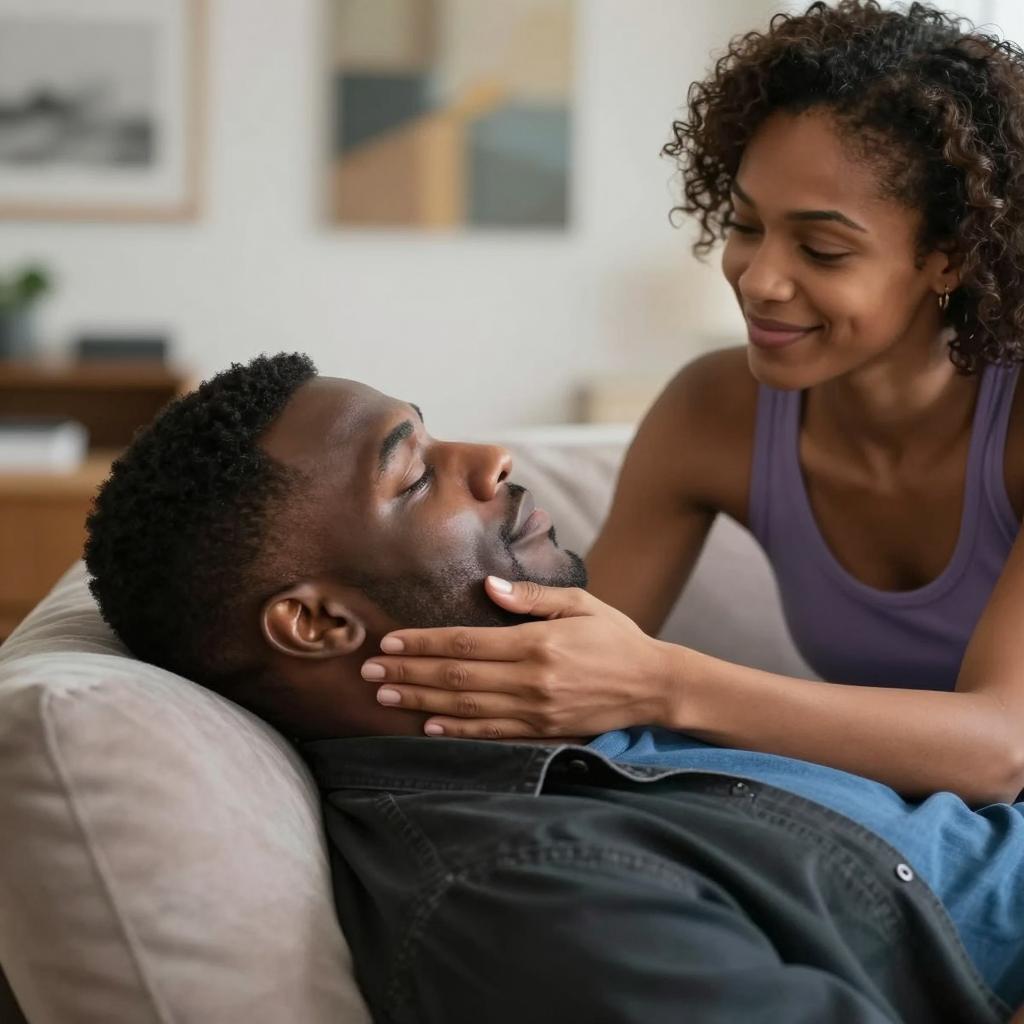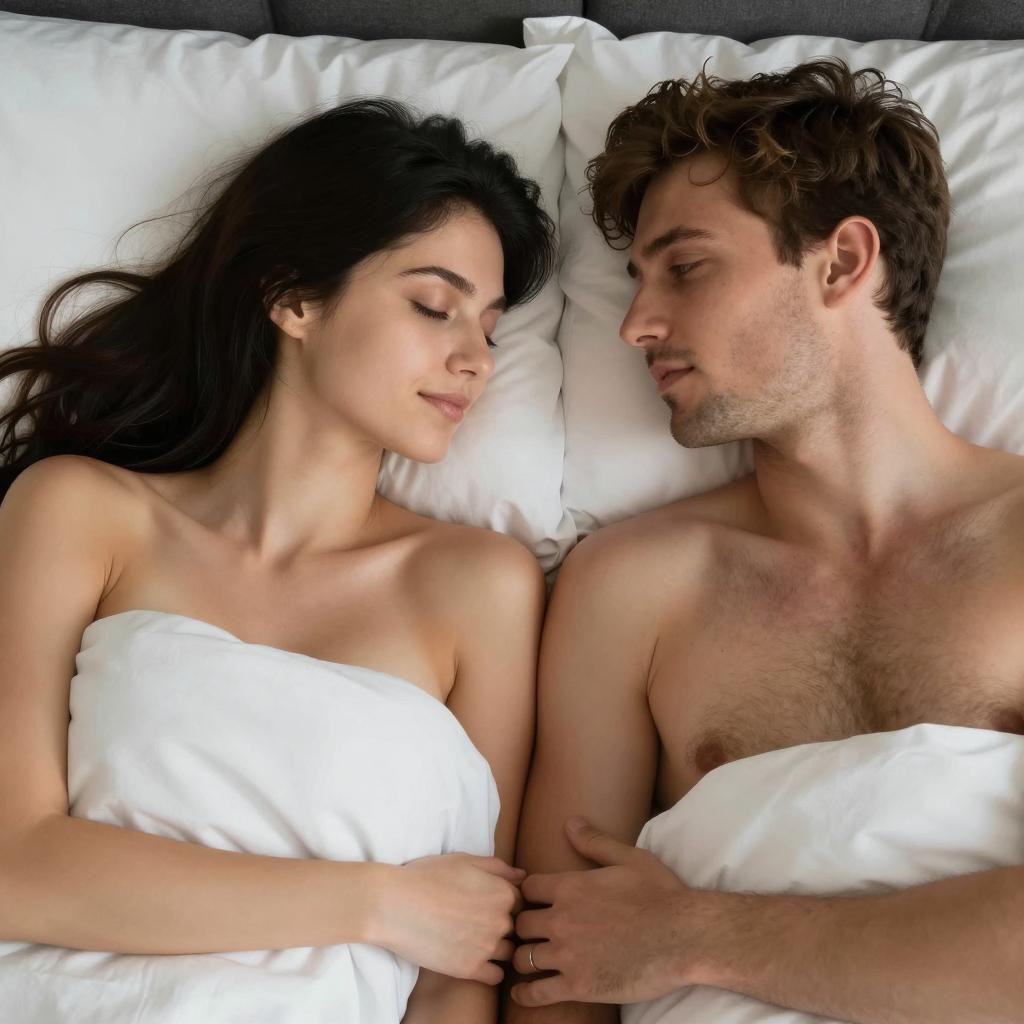 Photograph of a shirtless man and woman lying in bed, facing each other. The woman with long black hair, fair skin, and small breasts rests on white pillows, eyes closed. The man with short brown hair, fair skin, and a chest covered in hair, looks at her with a gentle expression. Their hands are intertwined. White sheets partially cover them.