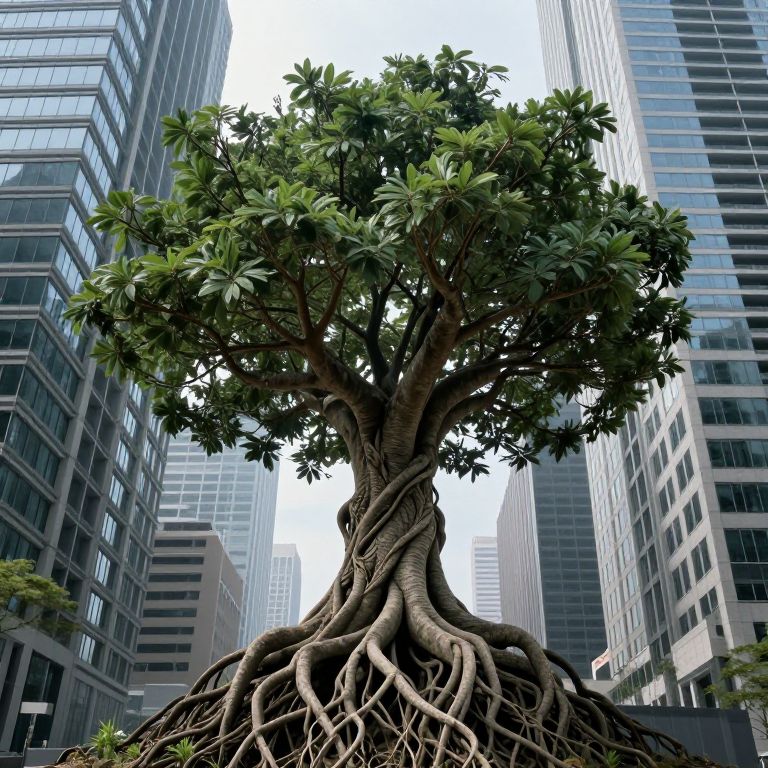 Photograph of a large, leafy tree with extensive, twisting roots, standing amidst tall, modern skyscrapers in an urban setting.
