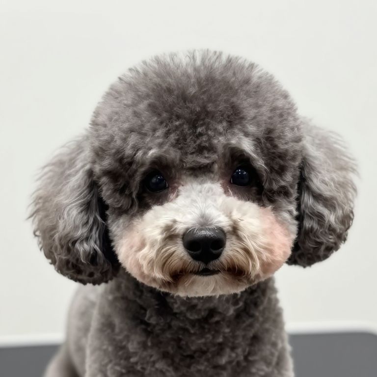 Poodle with bad haircut, detailed close-up of a dog with botched grooming, uneven fur lines, subtle humor in facial expression, studio lighting, high resolution, contemporary digital art