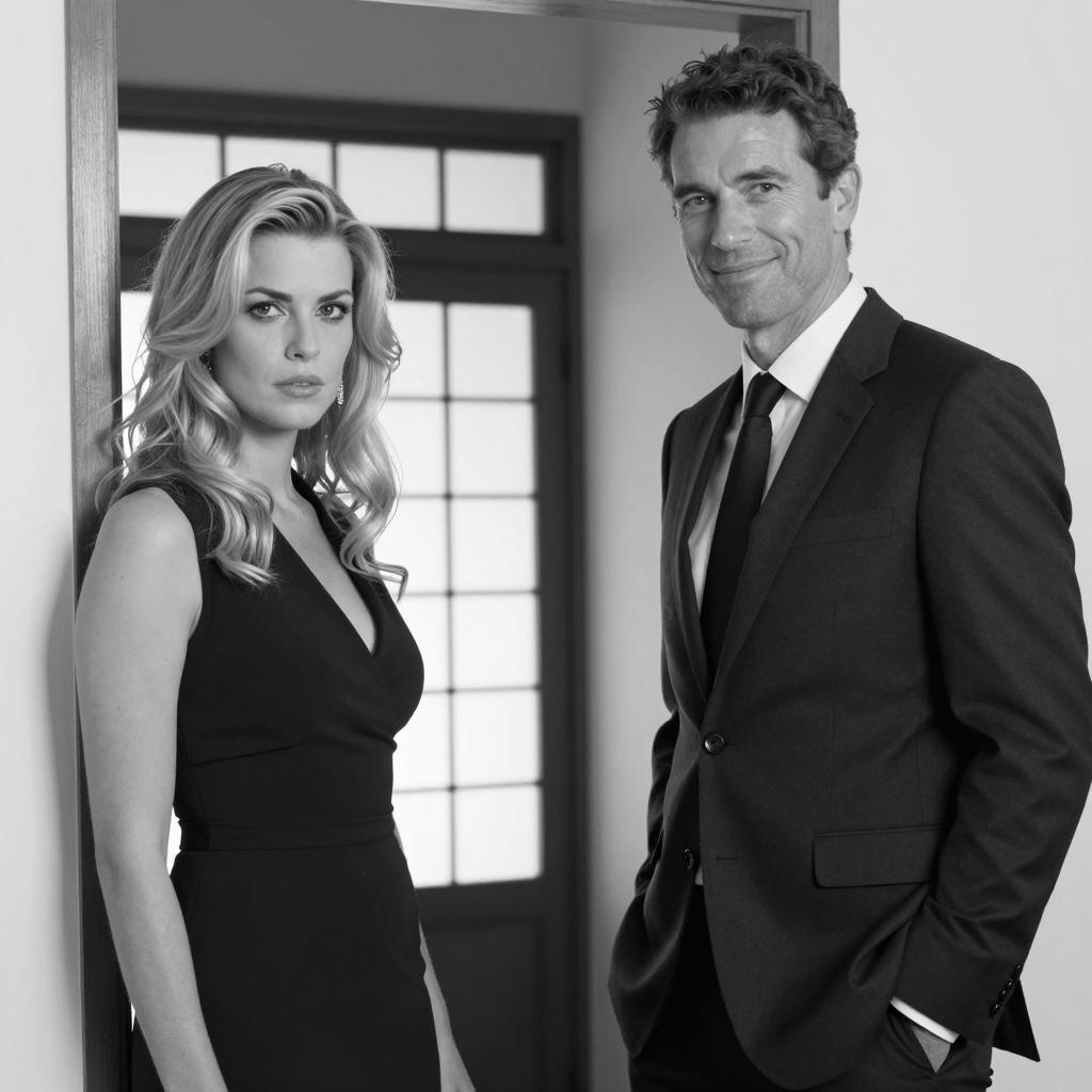 Three people. Dark-haired man in black shirt, left. Blonde woman in red and blue dress, center. Dark-haired man in black suit, polka dot tie, and hat, right. Holding cane, saluting. Pink roses in background. All standing close together. Intense expressions. White background.