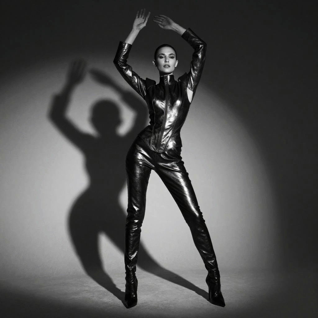 Female model full body pose, dramatic studio lighting with bold shadows, avant-garde outfit with metallic and leather materials, striking stance with arms raised, futuristic vibe, high contrast monochrome palette, editorial fashion shoot