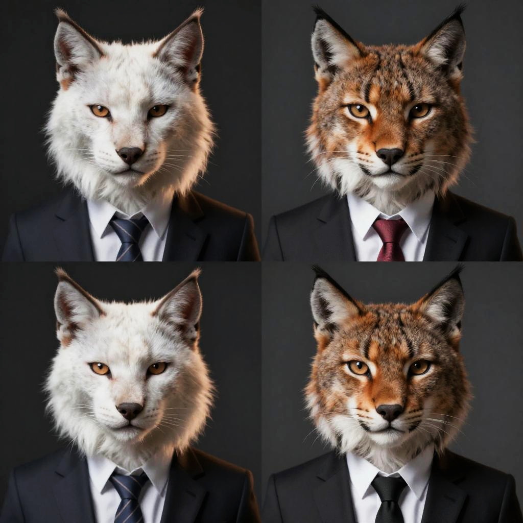 A digital collage of four photos featuring a CGI anthropomorphic lynx in a suit. The top left image shows the lynx with white fur, lit dramatically. Top right: a well-lit lynx with brown fur and a red tie. Bottom left: a blurry, white-lit lynx. Bottom right: a brown-furred lynx with a black tie. Each image has a professional, slightly dark background.