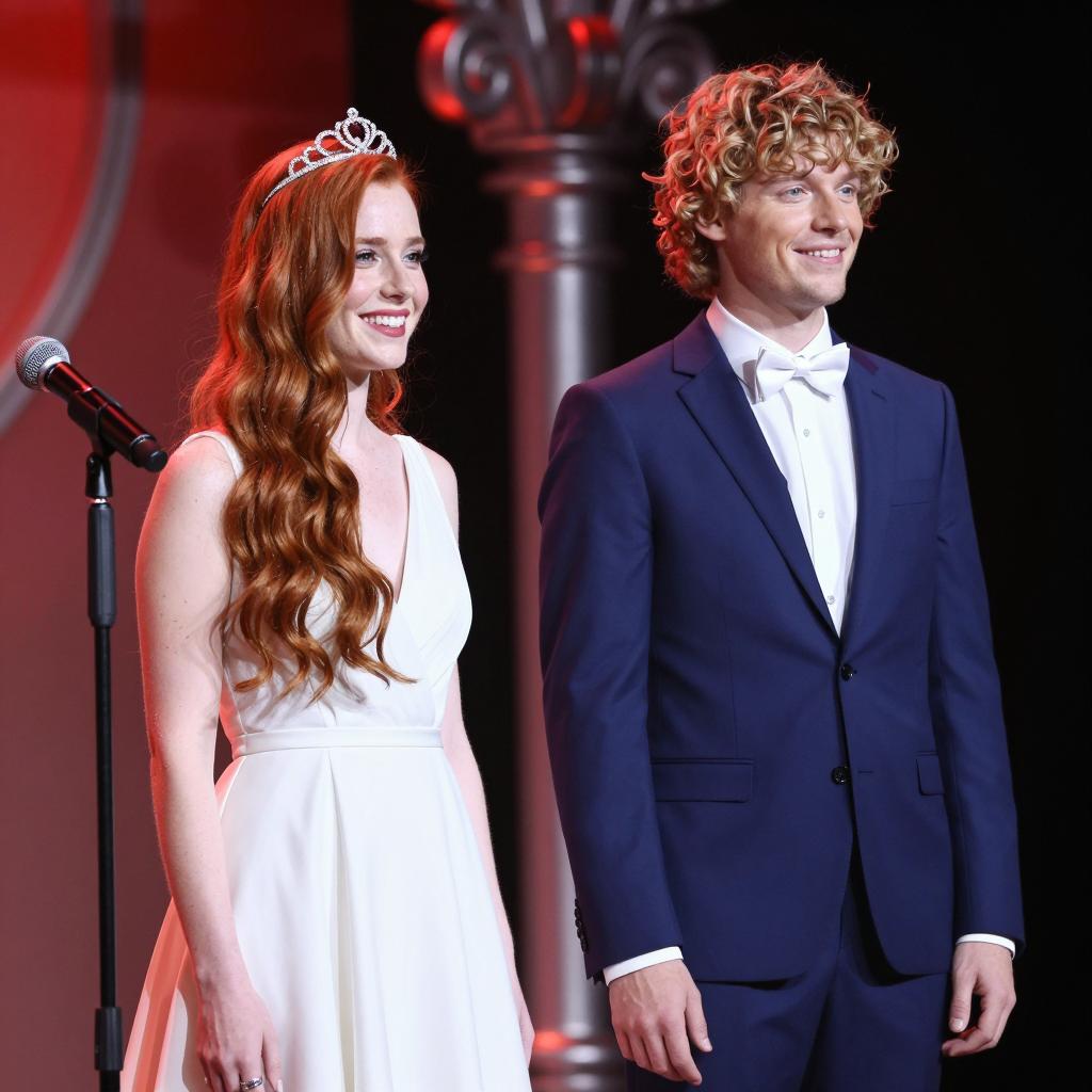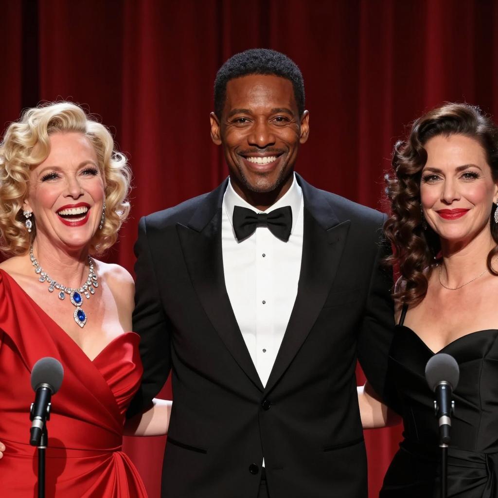Three women on stage holding awards. Left: older woman with short blonde hair, beige patterned blazer, white blouse, holding award with rose. Center: young woman with long brown hair, white sleeveless dress, number 8. Right: young woman with curly brown hair, pink dress with lace detail, number 6. Dark background with silver tinsel.