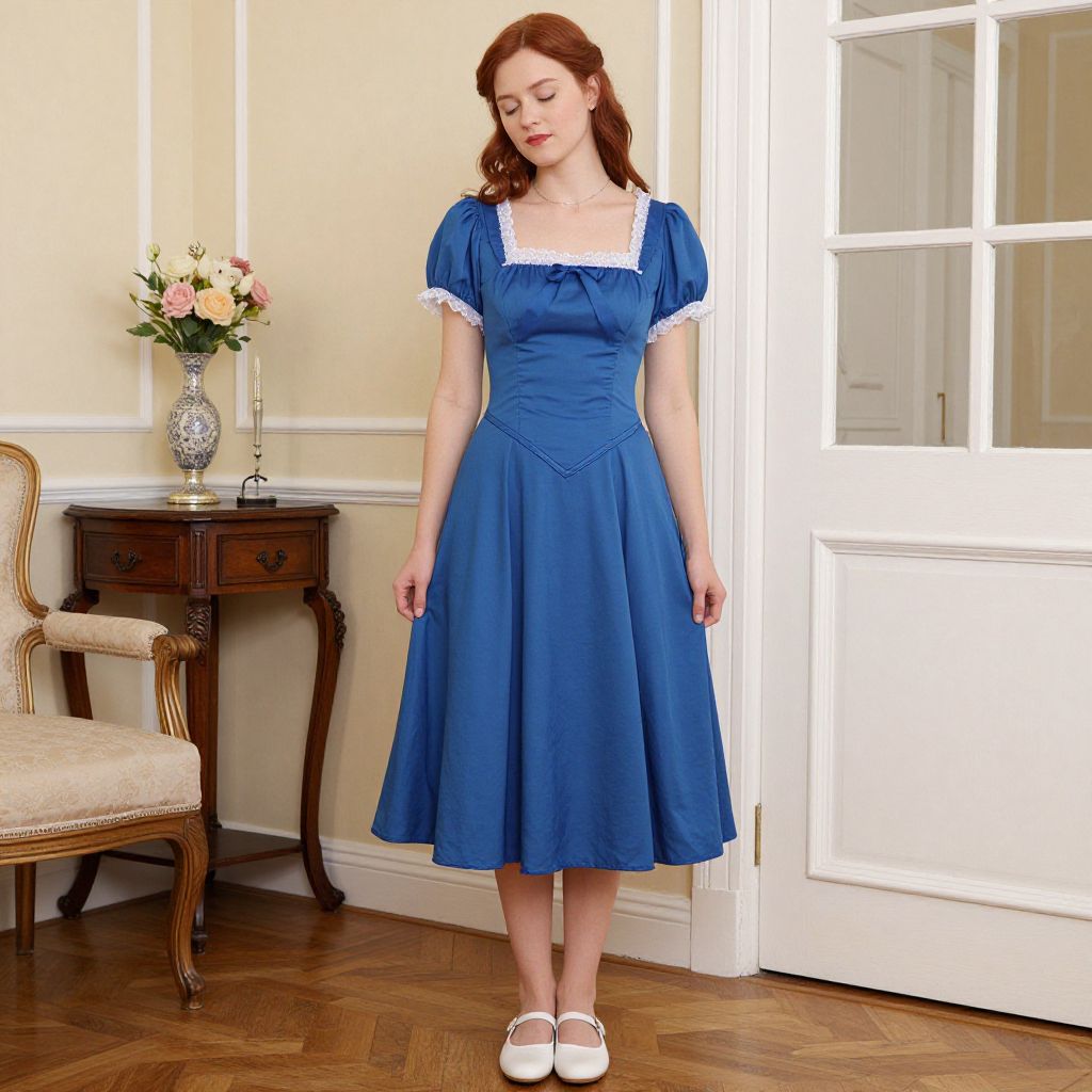 Photograph of a fair-skinned, red-haired woman wearing a blue, puffed-sleeve, square-neck dress, standing in a vintage-style
