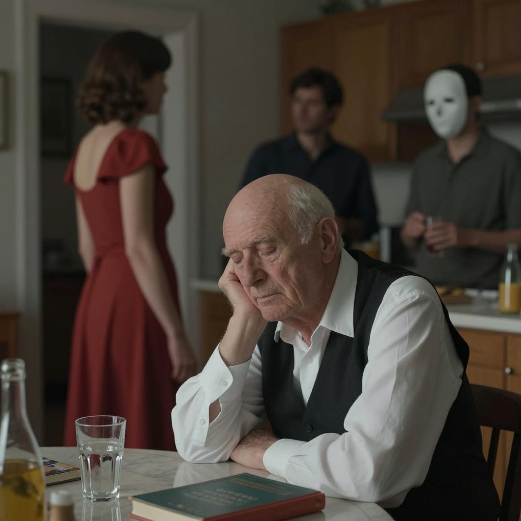 Man with brown mustache, wearing brown patterned suit, blue shirt, leaning on dark wooden podium, looking at small TV screen. TV shows old man with bald head, wearing striped shirt. Lamp with beige shade on left, wooden cabinet with carvings on right. Dimly lit room with beige walls.