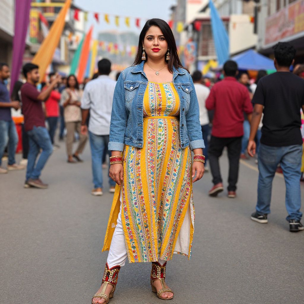 A vibrant, lifestyle-style image of an Indo-Western woman in a bold costume, wearing a printed cotton kurta with a Western denim jacket and ethnic Western-inspired heels, her face is clear and bright with bright red lips and a confident gaze, standing in a crowded festival street with colorful flags, music, and dancing crowds around, capturing a lively and joyful atmosphere. The woman has big tits and cute face
