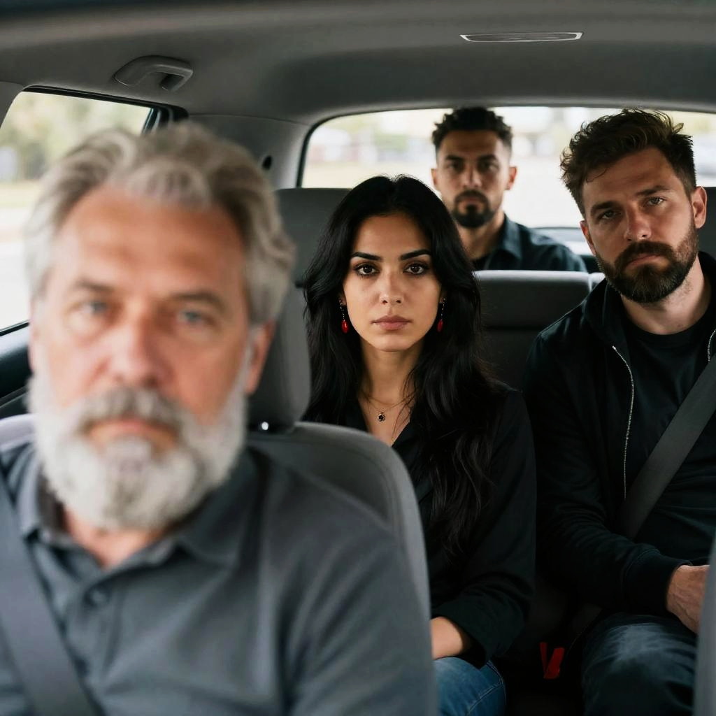 Photograph of a bus interior. Five people: red-haired man in green shirt, blue jeans, center, walking forward; blonde woman in green dress, left, covering mouth in shock; bearded man in blue shirt, right of red-haired man, serious expression; brunette woman, right, wearing black tank top, looking forward; dark-haired woman, far right, wearing black top, serious expression. Bus window, frosted glass; "Vista Pacific" sign, top left; overhead luggage rack, top left; seats, foreground.