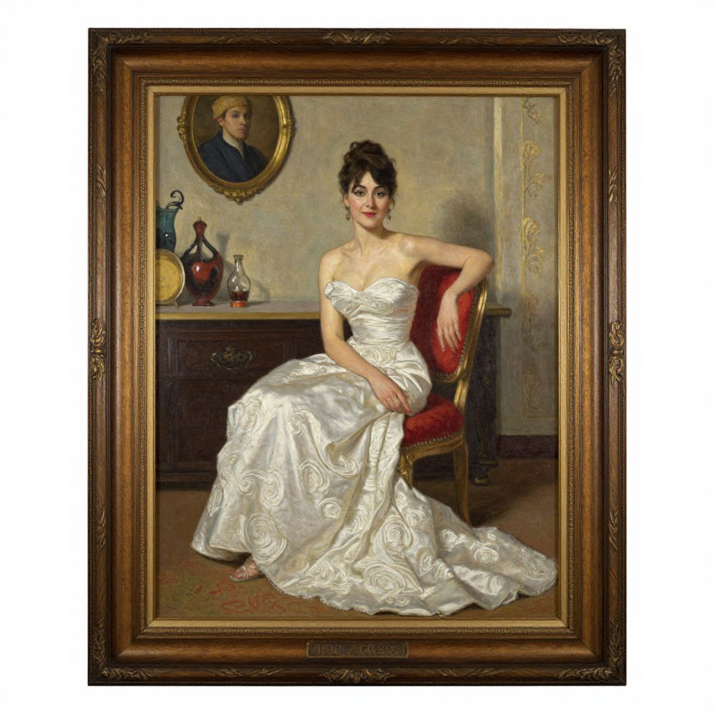 Framed oil painting titled \"The Actress\" depicts a woman in a strapless white gown seated gracefully on a red cushioned chair, with a dark wooden frame and intricate gold detailing surrounding the canvas, set against a muted background featuring a wall-mounted portrait and decorative items.