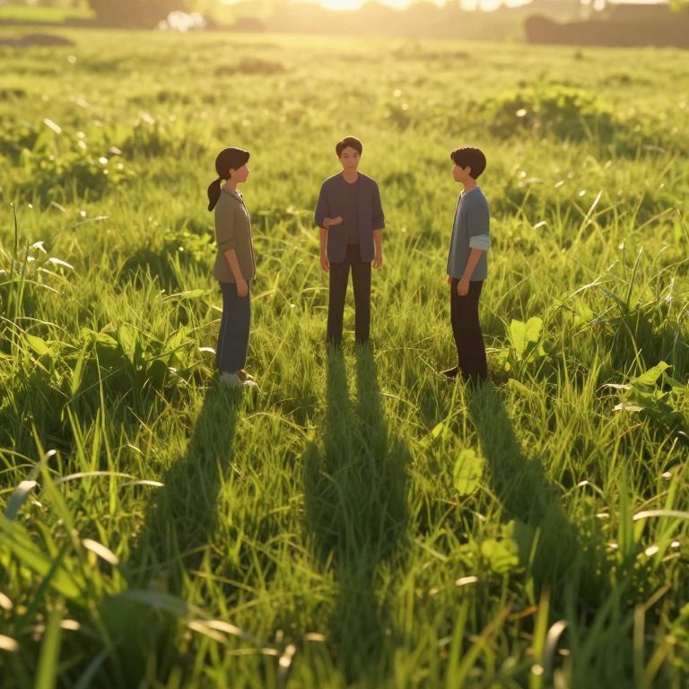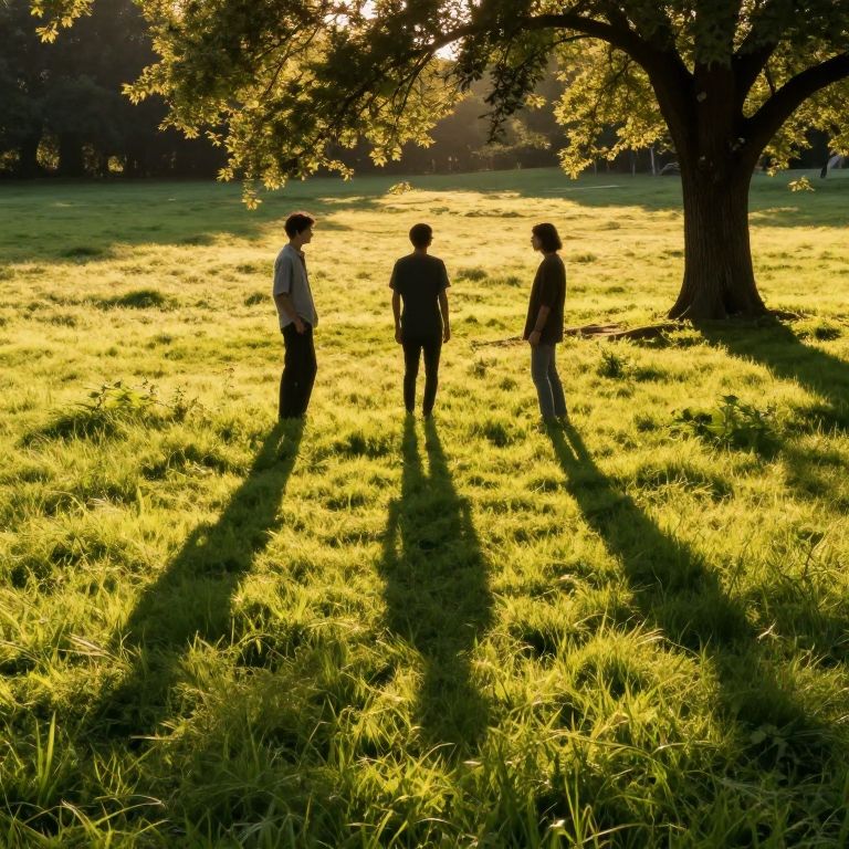 In a serene meadow bathed in golden sunlight, three individuals stand as their elongated shadows transform into distinct, sentient forms, mirroring their postures and engaging in silent, ethereal dialogue beneath the trees.