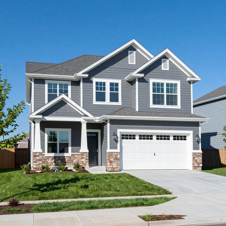 Contemporary single-family home at 13531 W 85th Dr, Arvada, Colorado 80005, featuring a two-story design with gray siding, white trim, and a spacious garage, surrounded by a well-maintained lawn and landscaping under a clear blue sky.