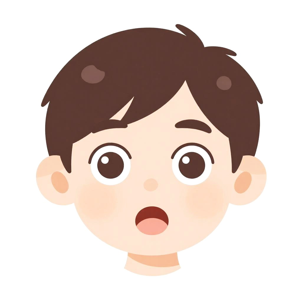 Digital cartoon of a surprised young boy with dark brown hair, wide brown eyes, and an open mouth on a white background.