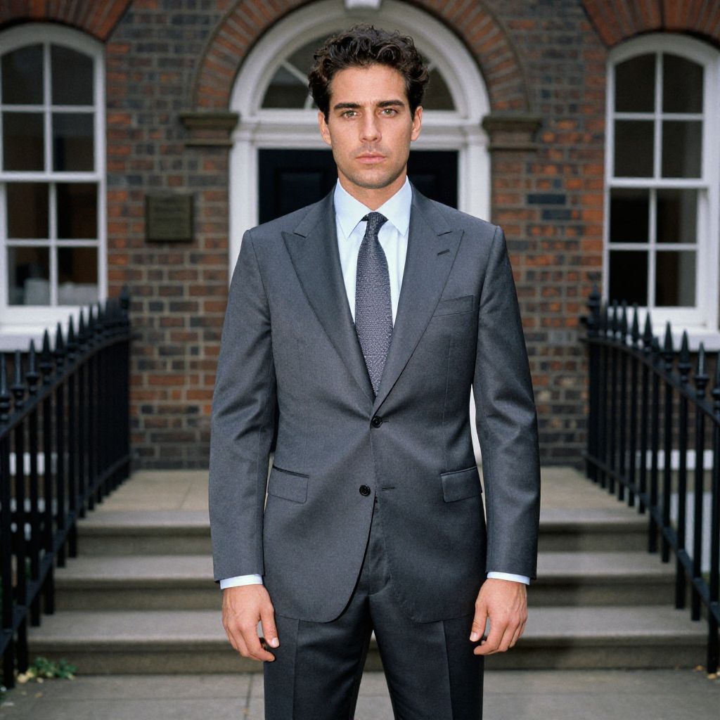A man, couture formal satin finish suit, charcoal gray, structured silhouette, notch lapel jacket, tailored satin trousers, pale blue dress shirt, textured silk tie in dark gray, historic brick building, large arched windows, welcoming front steps, Ilford film stock, confident expression. Man has masculine face and piercing eyes