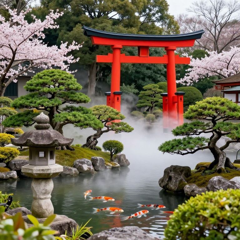 Japanese garden with a tranquil pond, bonsai trees, stone lanterns, a red iconic torii gate standing tall, koi fish swimming gracefully, mist hovering in the air, vibrant greenery and blooming cherry blossom trees around