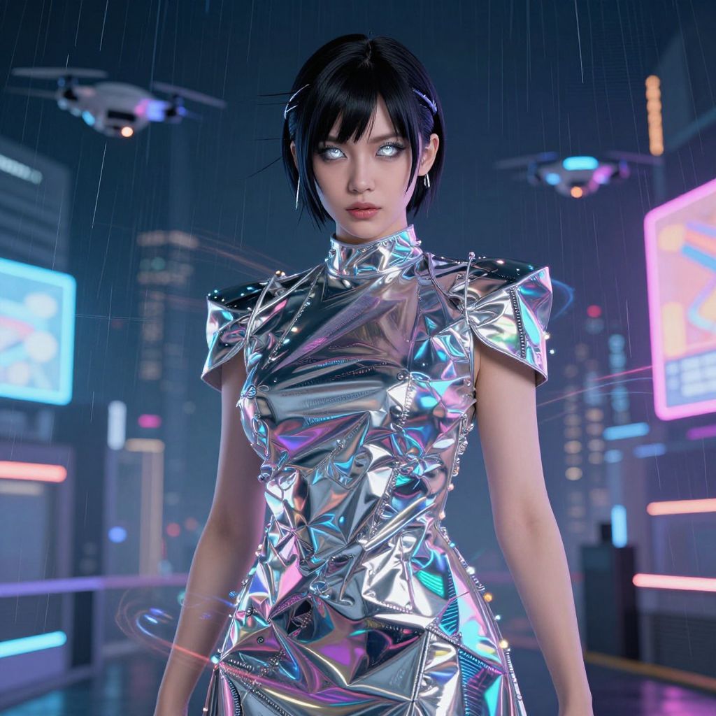 A futuristic woman with sharp, angular features and glowing silver eyes stands in a neon-lit cityscape, wearing a crinkled metallic fabric dress with a futuristic shimmer that catches the light in intricate patterns, the dress reflecting holographic textures and subtle movement as if it reacts to her motion, background filled with flying drones and ambient digital rain.. The woman has big tits and cute face