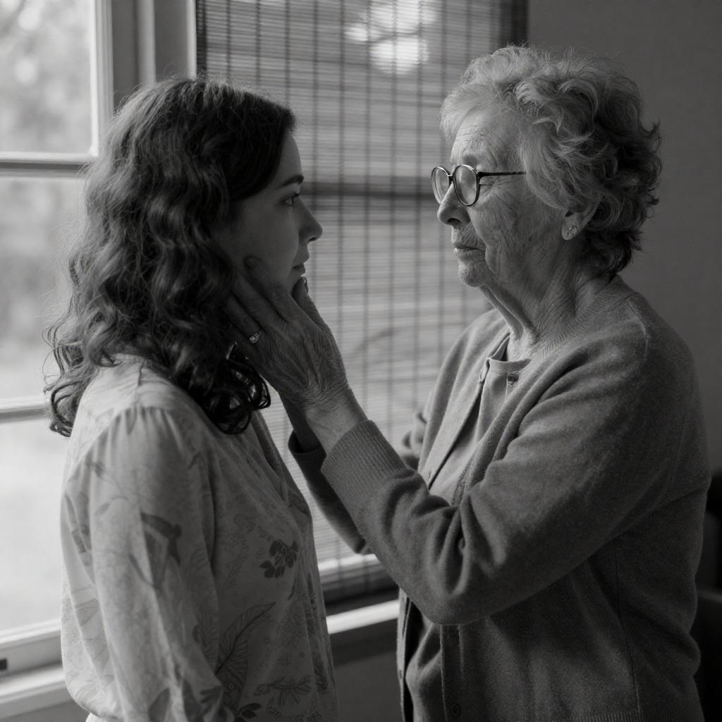 Black-and-white portrait of an elderly woman with short curly hair and glasses gently holding the face of a younger woman with wavy hair and a patterned blouse. Both women appear solemn, standing indoors near a window with bamboo blinds and natural light filtering through.