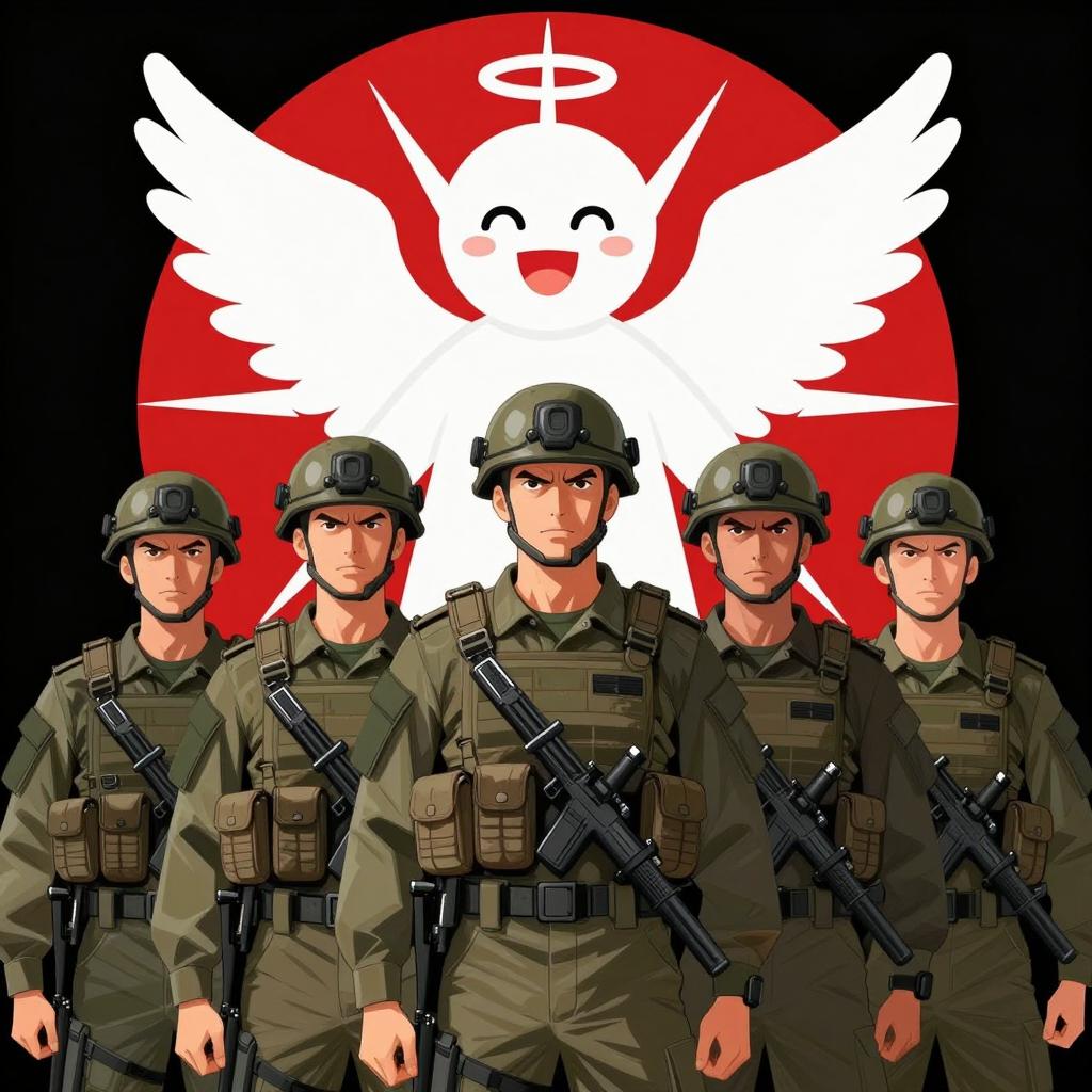 Illustration of five soldiers in military gear, standing in a group, in front of a large red circle with white rays. A white, smiling, cartoon angel with wings is above them. Soldiers have intense or determined expressions. Black background.