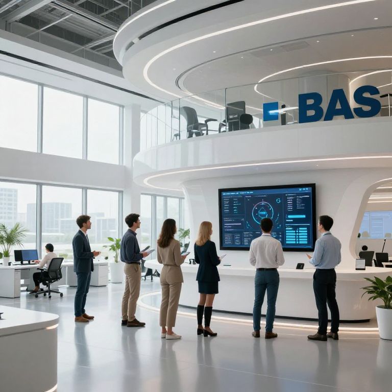 Photograph of modern office with large windows, white curved walls, and blue "BAS" sign; five business professionals standing near a display screen.