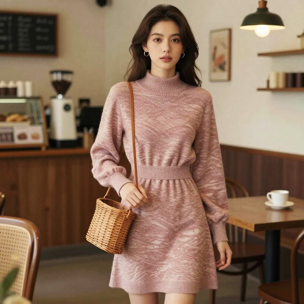 A woman in a casual chic style, wearing an oversized white knit sweater and a black and white houndstooth mini skirt, stands in a courtyard dining area near ivy-covered walls. Sexy. Pretty face and beutiful eyes