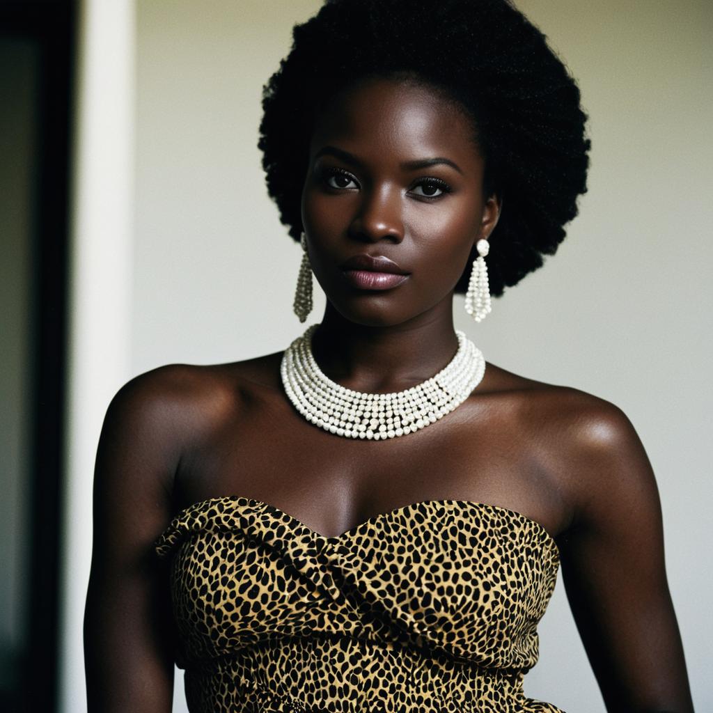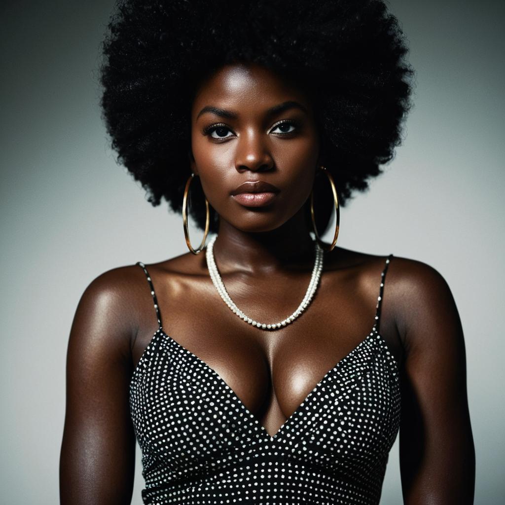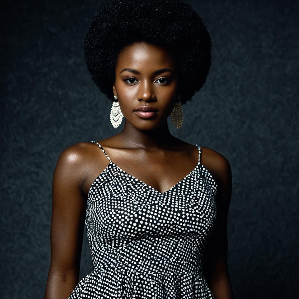 Portrait of a confident dark-skinned African woman with a natural afro hairstyle. She is wearing a black dress with white polka dots, large hoop earrings, and a pearl necklace. The image captures her glowing skin and subtle makeup highlighting her full lips and expressive eyes.