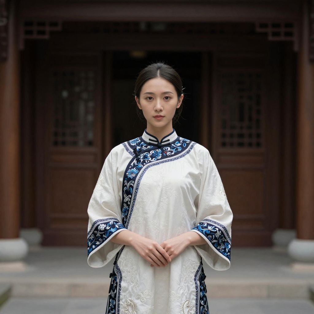 Traditional Dress Asia, a woman in a traditional chinese dress standing in front of a building