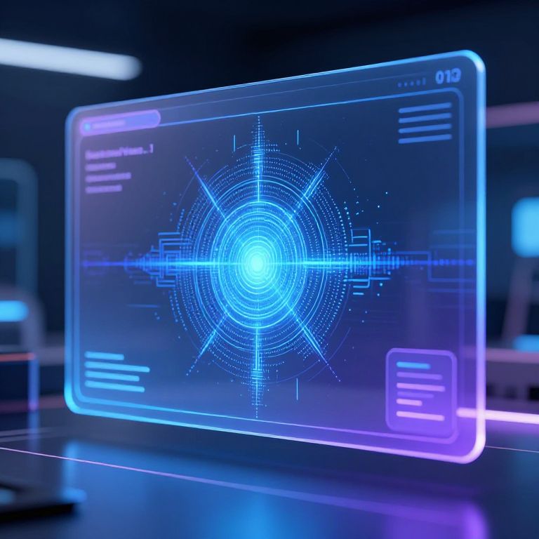 Digital holographic interface displaying a glowing blue circular grid with radial lines, floating against a dark, futuristic background.