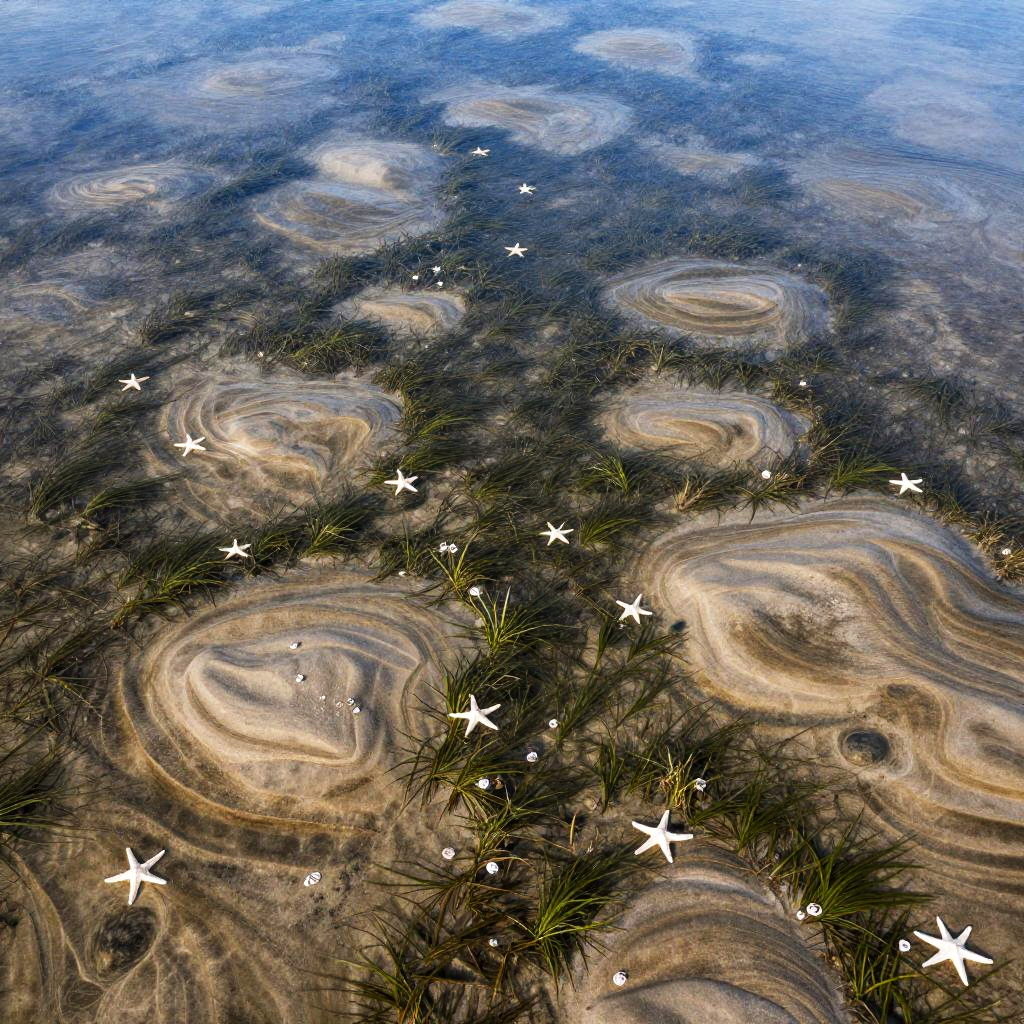 Aerial view of ocean floor texture revealing sprawling fields of sea grass, undulating sand dunes, scattered starfish and shells, with sunlight filtering through the calm ocean surface, high detail