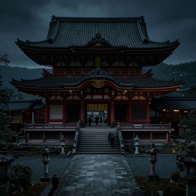 A photograph of a traditional Japanese temple at dusk, featuring a large, intricately designed pagoda-style roof with dark, weathered tiles. The temple's red wooden beams and dark wooden panels contrast against the moody, dark blue sky. A stone pathway leads to the entrance, where a few people are visible, dressed in dark, traditional clothing. Flanking the pathway are stone lanterns and small shrubs. The background includes misty, dark green hills, adding to the serene and mystical atmosphere. The temple's symmetrical design and the soft, diffused lighting create a tranquil yet dramatic scene.