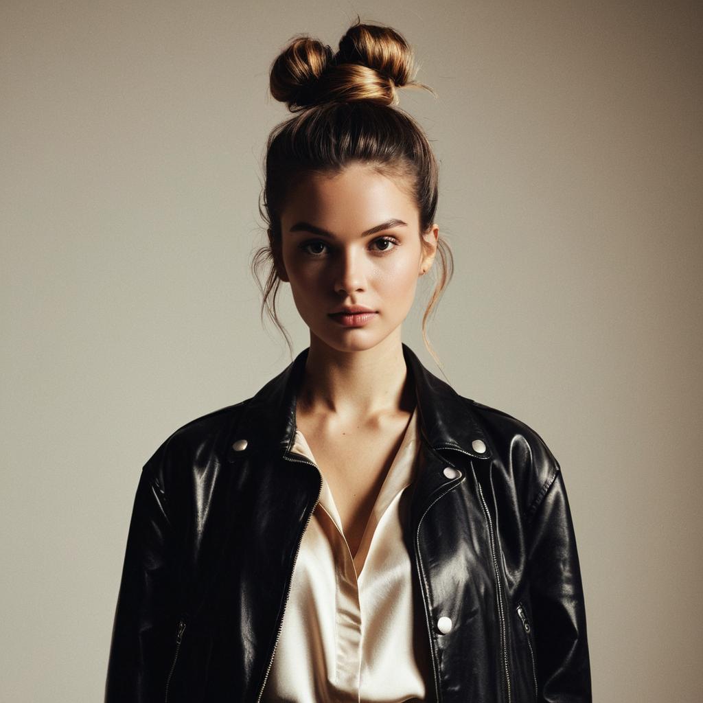 Portrait of a young woman with a wavy top knot hairstyle, wearing a black leather jacket over a white silk blouse. The image is captured in a minimalist studio setting with diffused warm lighting, emphasizing the fashion editorial style.