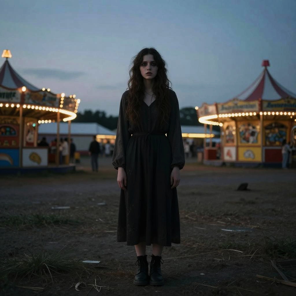 In a deserted carnival under twilight, she stands alone, a melancholic ghost drifting through a harsh reality. Her stunning yet elegiac whimsy is a testament to a heart hardened by suffering, inspired by the works of Mark Brooks and Gerda Wegener.